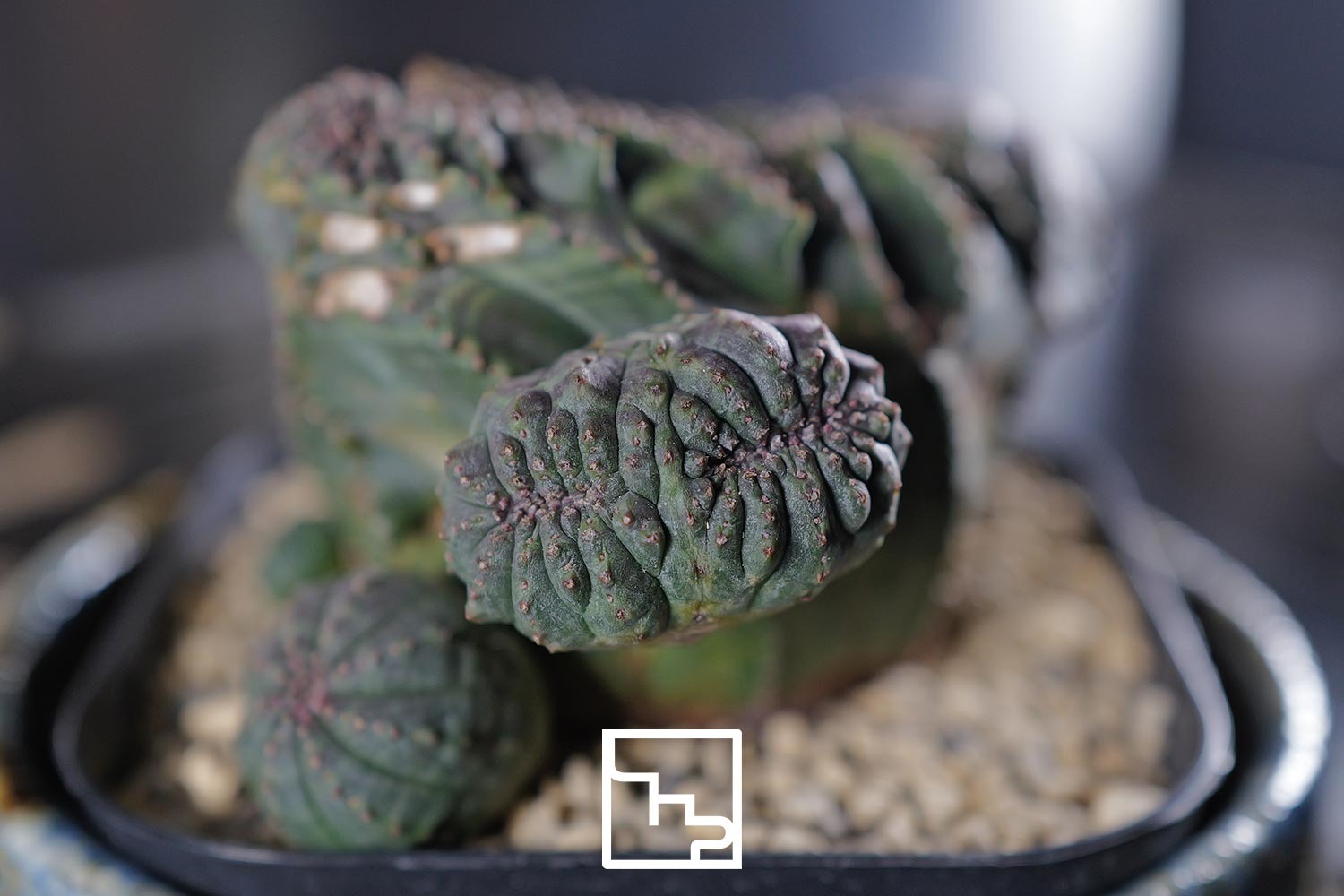 This Euphorbia obesa shows a pronounced crested growth spreading horizontally from the growth point. The continuous ribs create a sculptural mass, giving the plant a strong three-dimensional presence. Even the offset displays crested growth, indicating a consistent growth character throughout the plant. While the base remains relatively calm in form, the top develops a highly complex structure, further emphasized by an independent growth point at the edge, adding depth and tension to the overall composition.