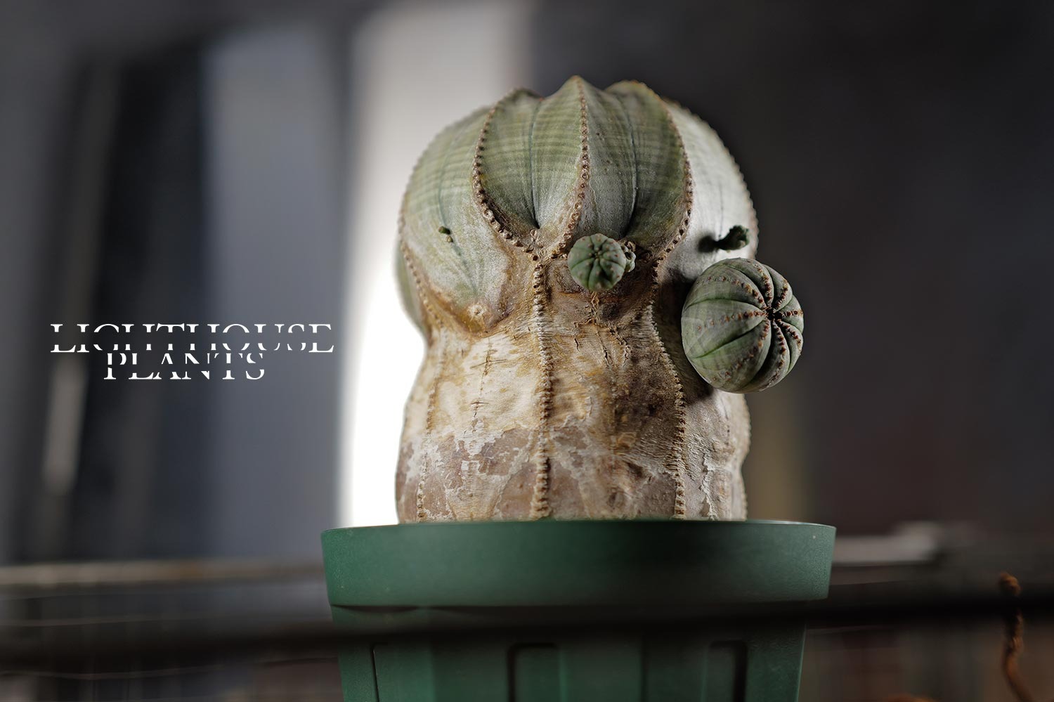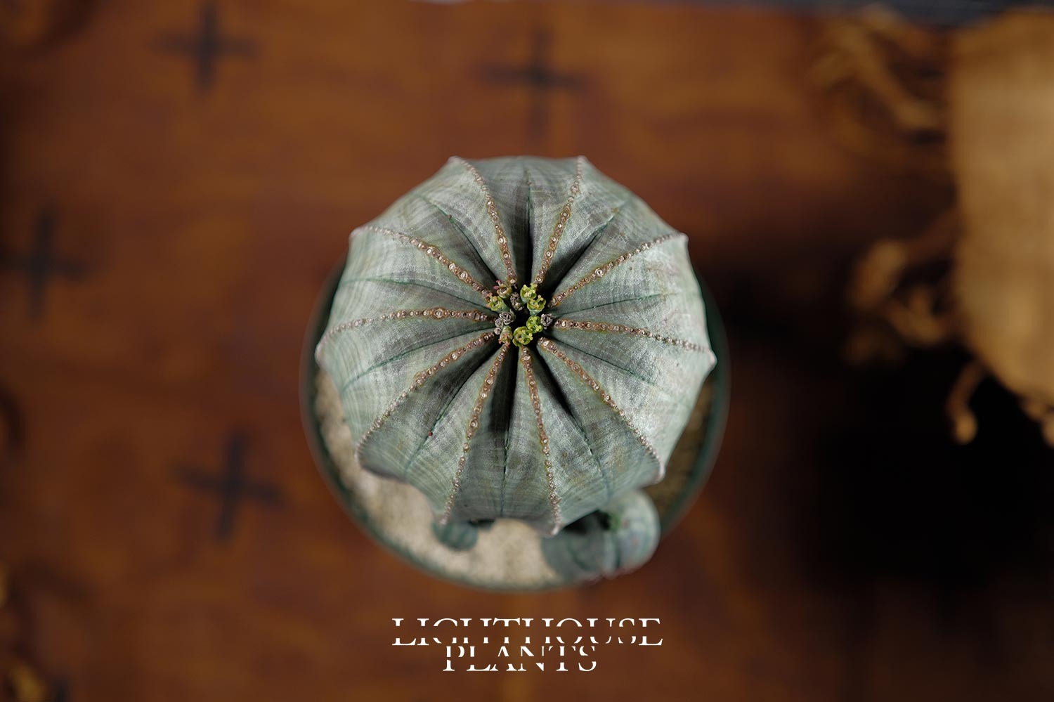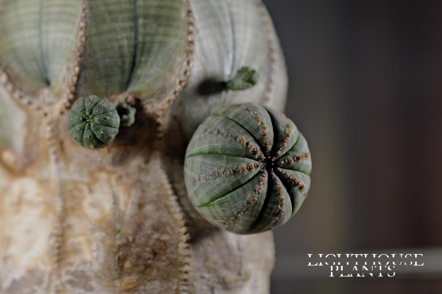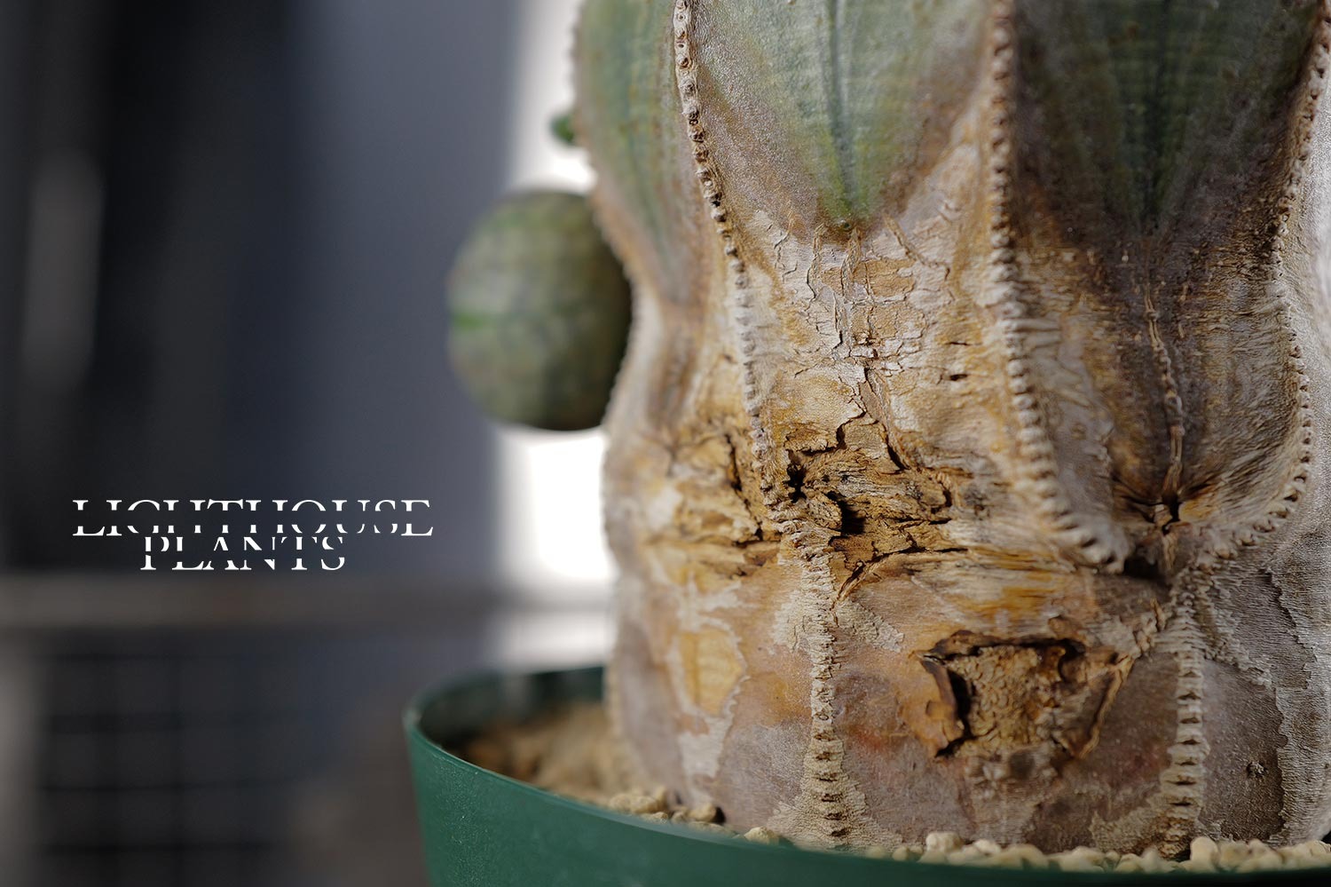 A stout vintage Euphorbia obesa with an impressive maximum width of about 9 cm. Strong corking has developed from the base up to the midsection, creating a clear contrast against the calmer green tone on the upper body. On the corked area, you can see marks that resemble old scars, and they add a rugged character that cannot be replicated intentionally. This is not only about size; the plant keeps a tight outline and well-defined ribs, showing the stability that comes with age. It is also producing offsets, so the future structure and surface changes will become even more interesting over time. Female plant, estimated to be around the 20-year class, with long-term collector value.