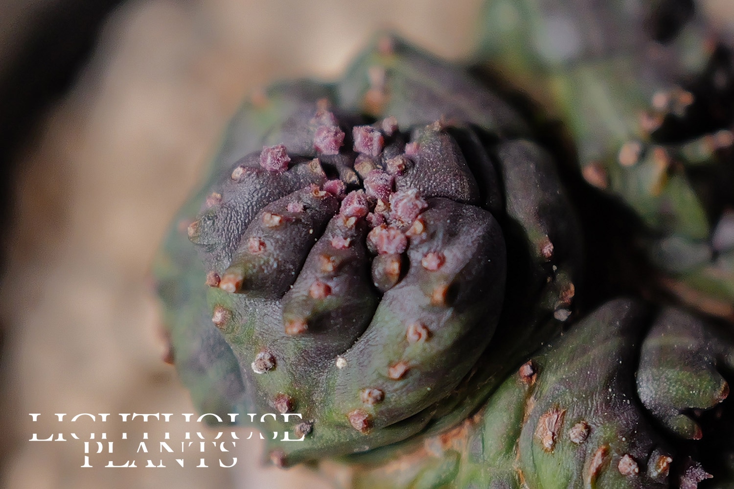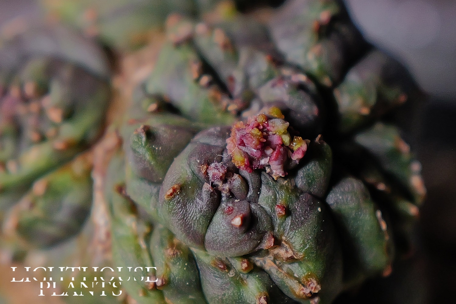 This is an extremely unusual micro Euphorbia obesa with three distinct growth points forming a crested structure.