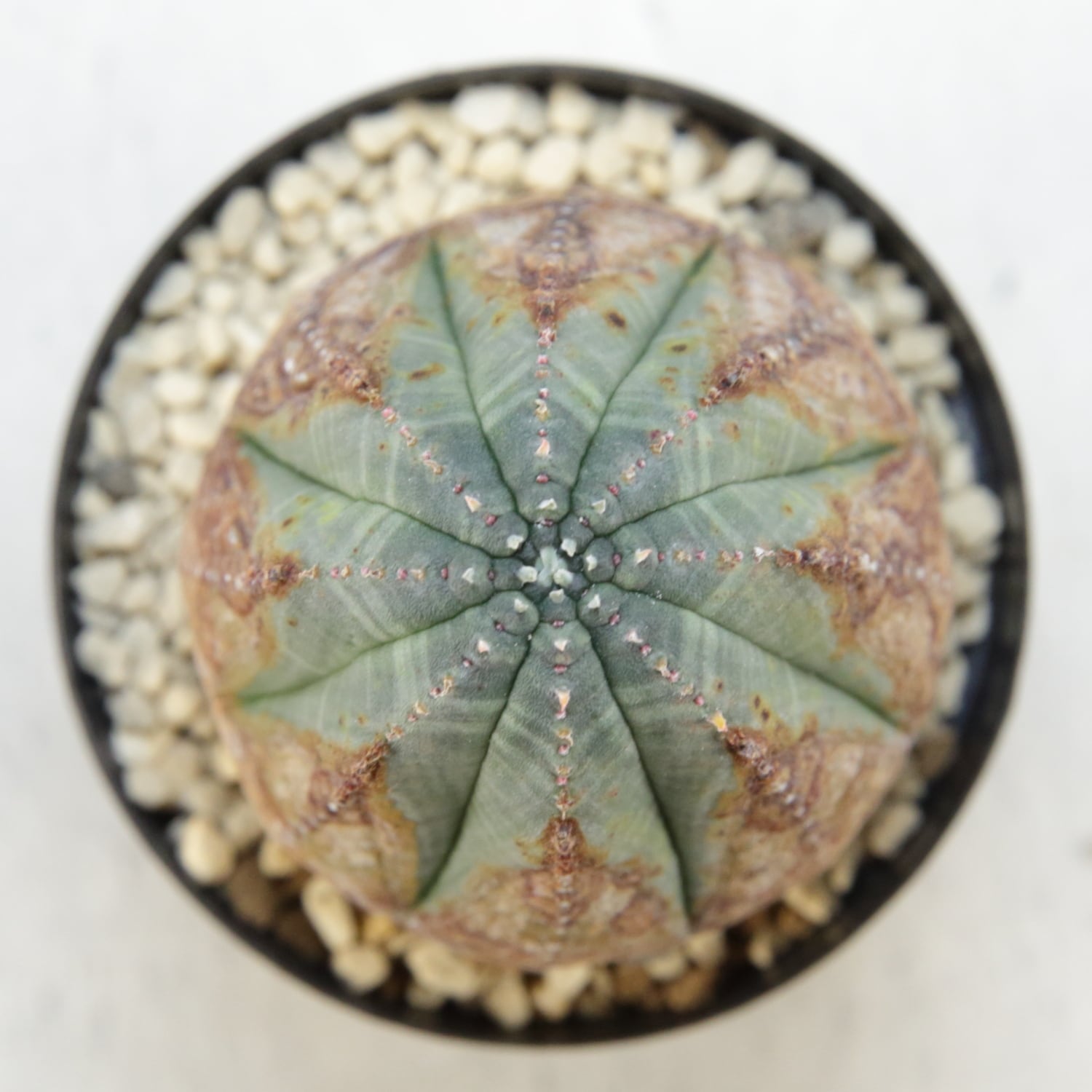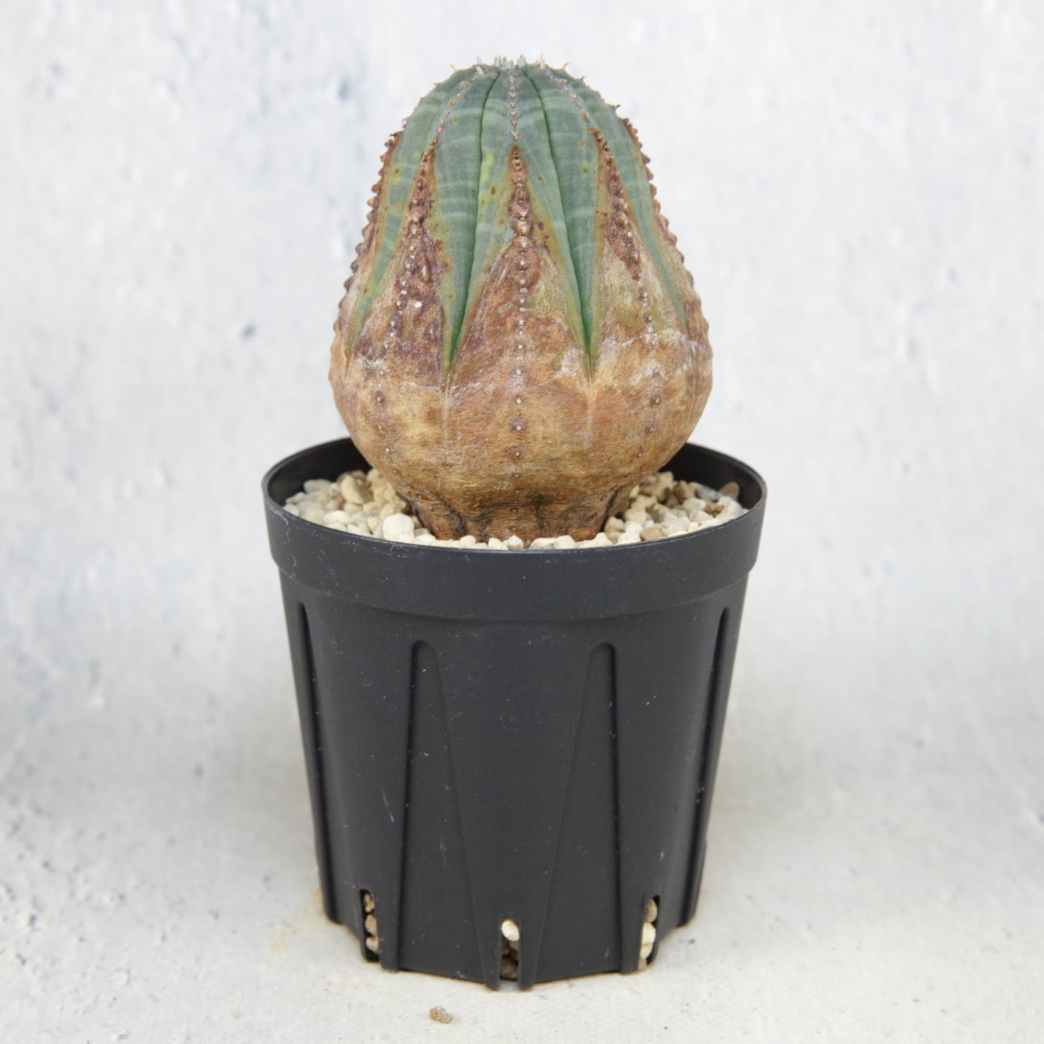 淡いグリーンと茶褐色のコントラストが美しく、小さな個体でありながら成熟株のような風格を感じさせます。