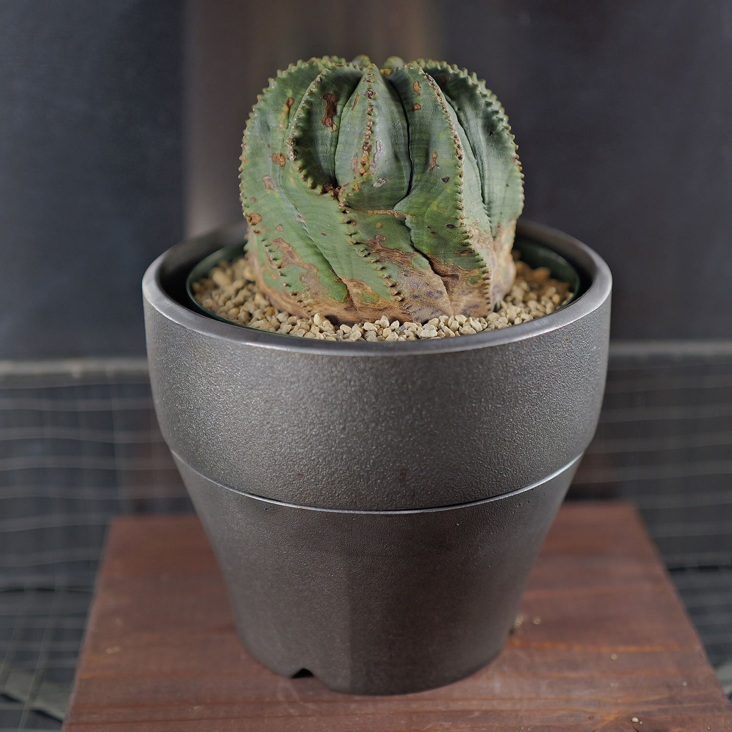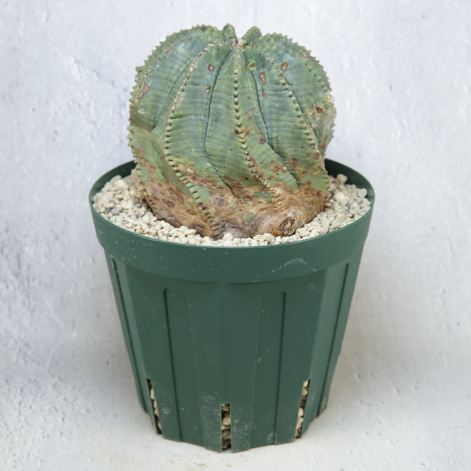 A powerful female Euphorbia obesa reaching about 8.5 cm in width, featuring a rare silhouette that is thick and compact rather than tall. Strong twisting along the ribs and beautifully developed woodiness rising from the base give the plant a mature, time-worn presence. Unlike the typical rounded large-form Obesa, this specimen showcases an uncommon “thick-bodied” architecture. As the twisting and woodiness continue to progress, its sculptural quality will only deepen—making it a standout piece for any serious collection.