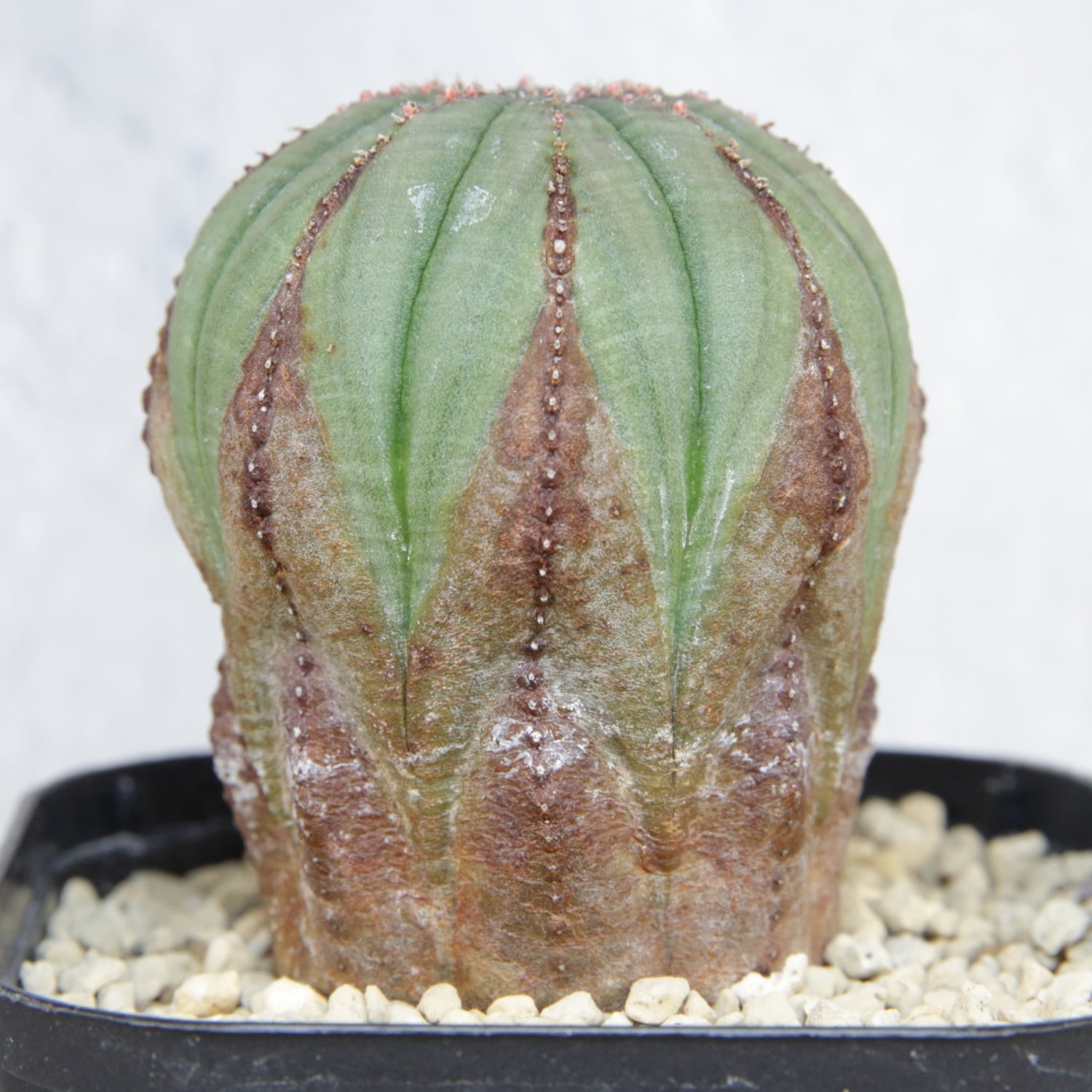 This female Euphorbia obesa features a striking gradient of texture, with the lower part heavily wood-textured and gradually shifting into a softer green toward the top. The irregular ridges and subtle surface patterns give the plant a sculptural presence, offering a different expression from every angle. As a female plant, it also holds potential for future seed production. A mature, character-rich specimen that will continue to develop even more depth as it grows.