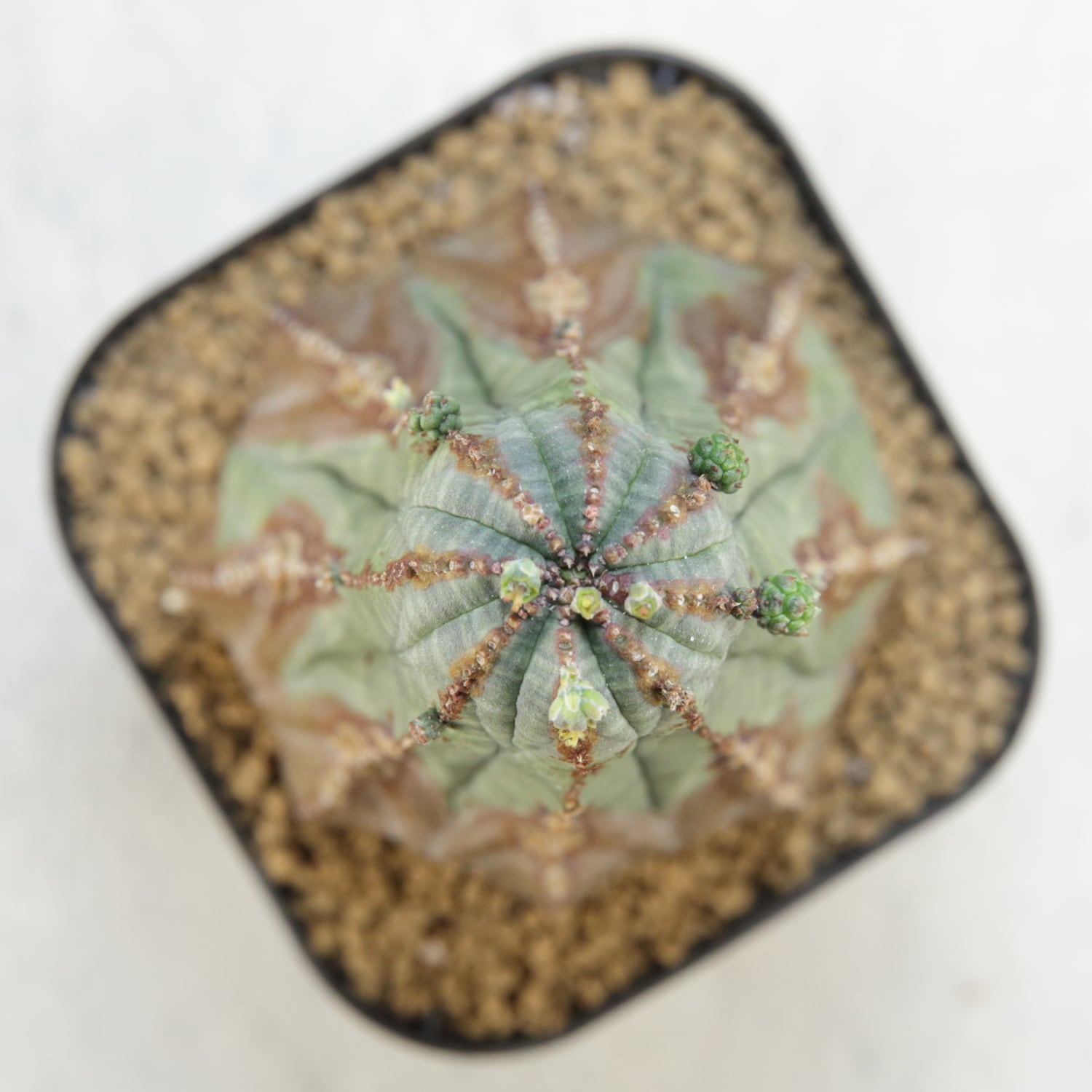 This is a rare mountain-type Euphorbia obesa with raised ridges that form a striking, sculptural silhouette. The rugged surface texture gives it a wild and natural character, adding depth to its presence. Tiny pups are already emerging around the crown, indicating high activity and strong potential for future clustering. A distinctive male plant that combines unique structure with the excitement of future growth.