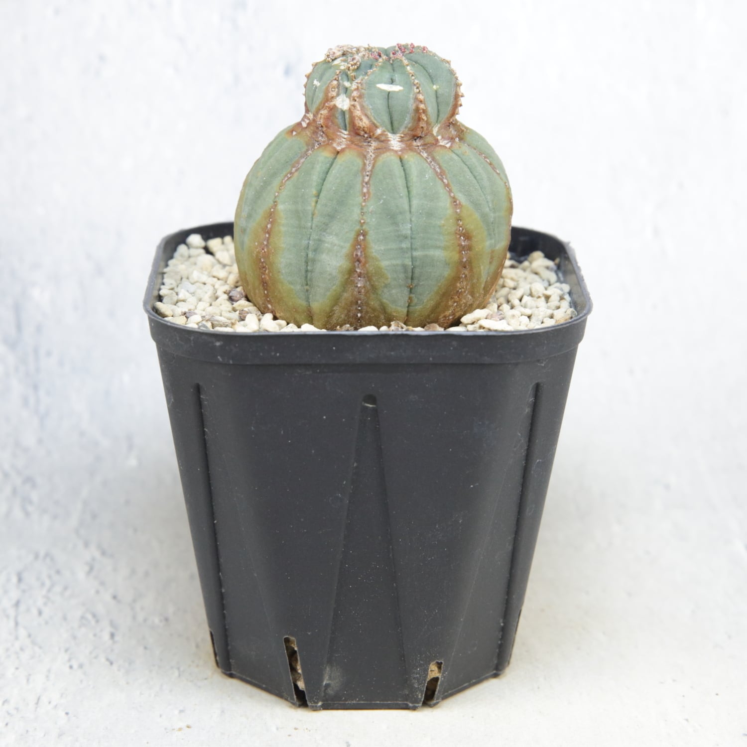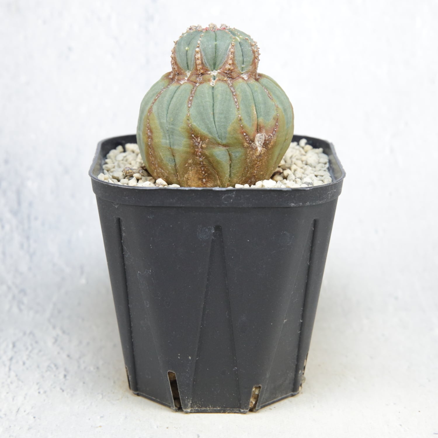 This Euphorbia obesa shows a striking twisted form, with a sharp contrast between the tighter upper body and the fuller lower section.
