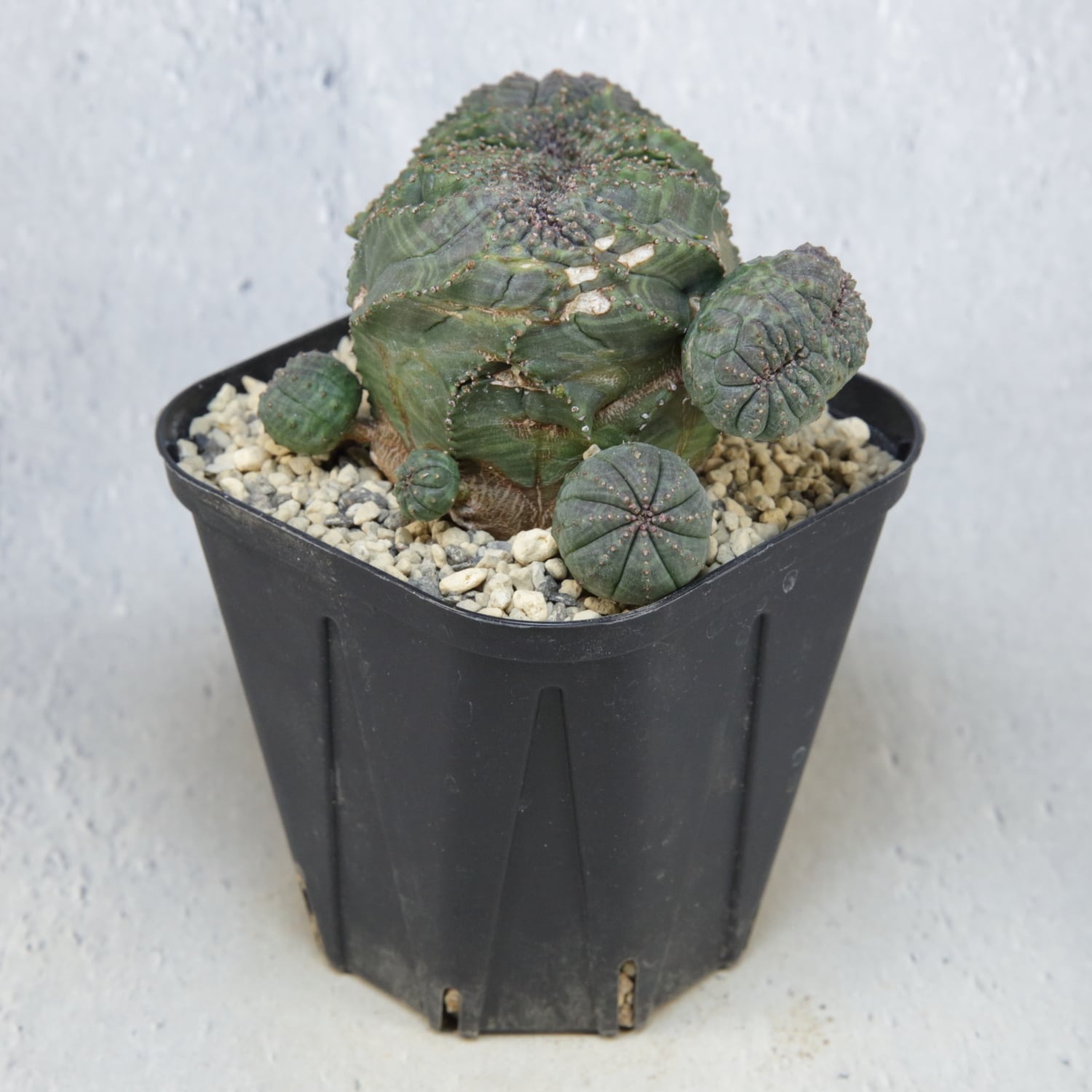 成長点が横方向に大きく展開した円扇綴化オベサ。稜が連続することで生まれる量感のあるフォルムは、自然がつくり出した立体構造そのものです。仔にも綴化が現れており、この株が持つ成長特性の強さがはっきりと読み取れます。ボトムの静かな造形からは想像できないほど、トップには情報量が集中し、角には独立した成長点の1頭が加わることで、造形全体に緊張感と奥行きを与えています。
