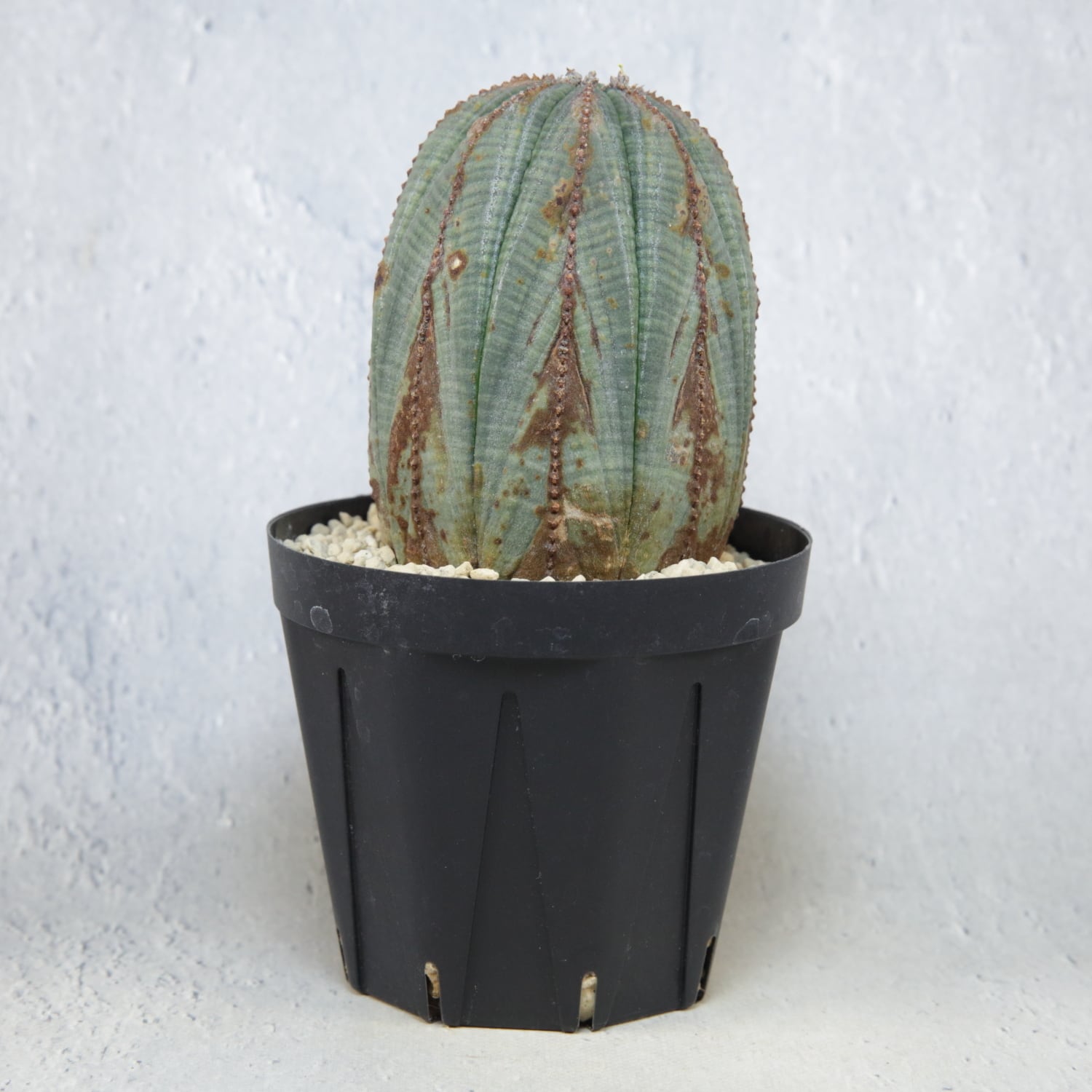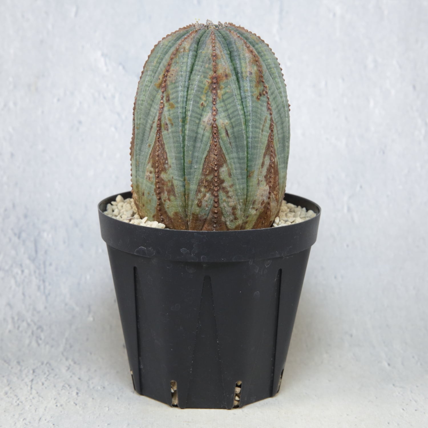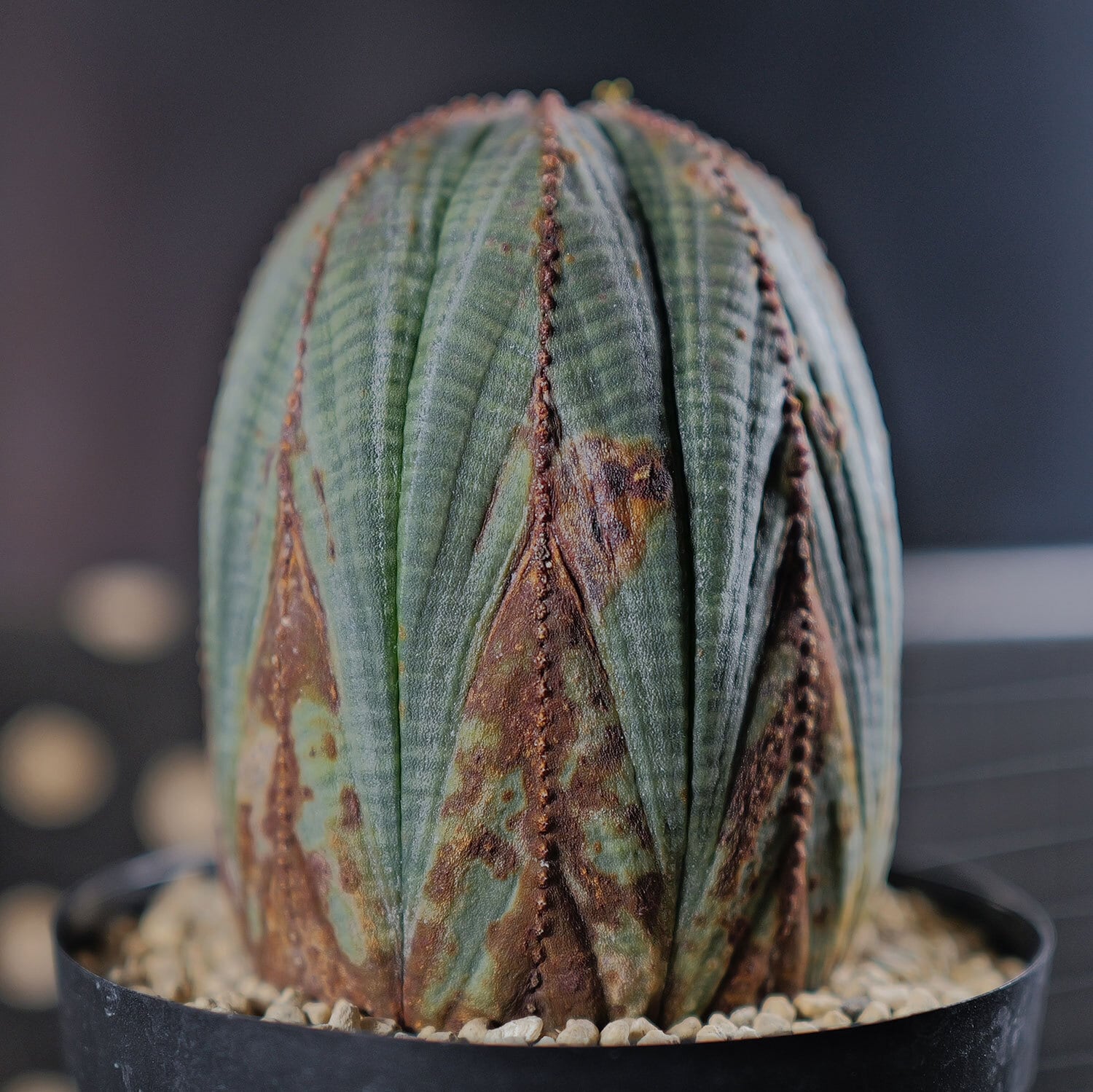 A well-balanced, larger-sized mountain-type Euphorbia obesa. The ribs rise evenly, creating a stable and harmonious silhouette that reflects slow, steady maturation over time. Layered coloration transitions from green to brown across the surface, enhancing the depth and sculptural presence unique to mountain forms. Fine granular textures along the rib edges add visual tension, preventing the large body from appearing flat or monotonous. This is a rare male plant with stable flower bud development, offering a well-balanced combination of size, form, and sex suitable as a centerpiece in a serious collection.