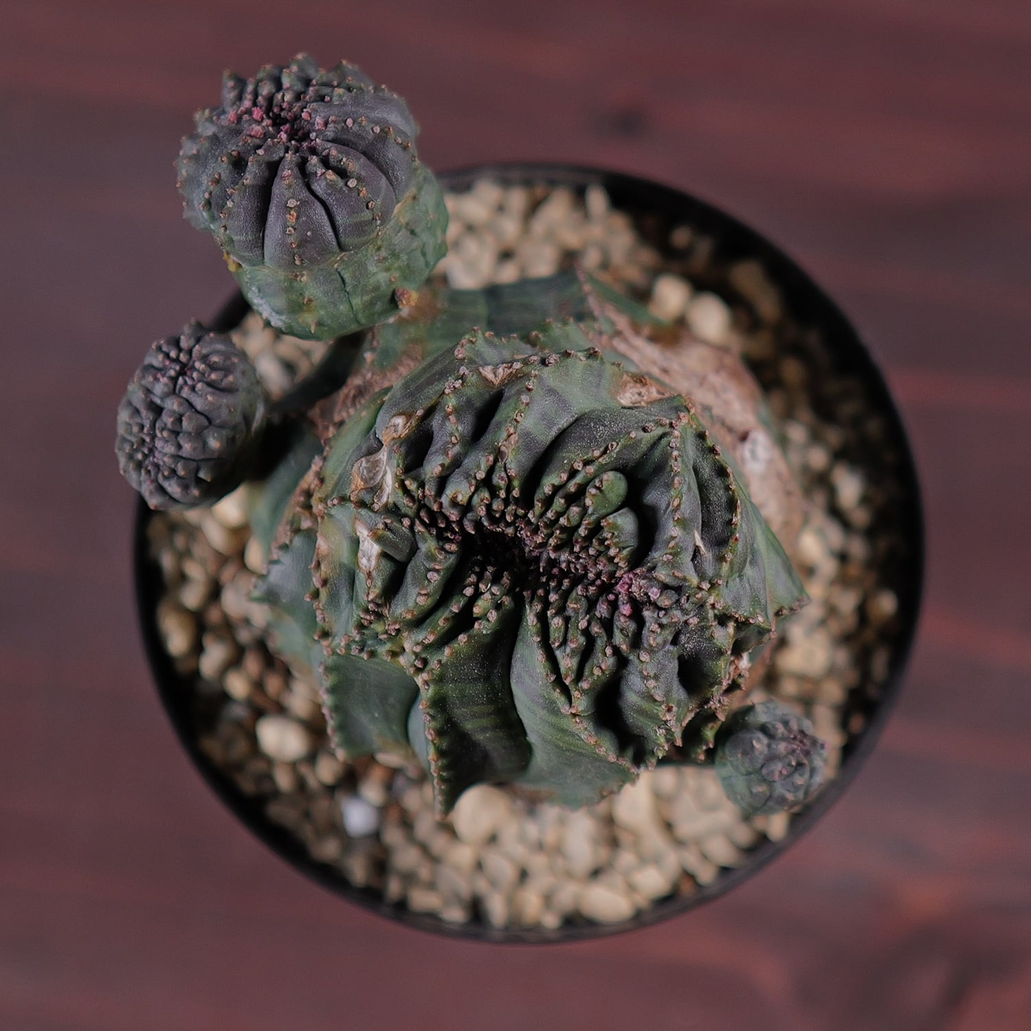 This Euphorbia obesa is an extremely rare specimen where both the parent plant and its offsets exhibit true crested growth.
