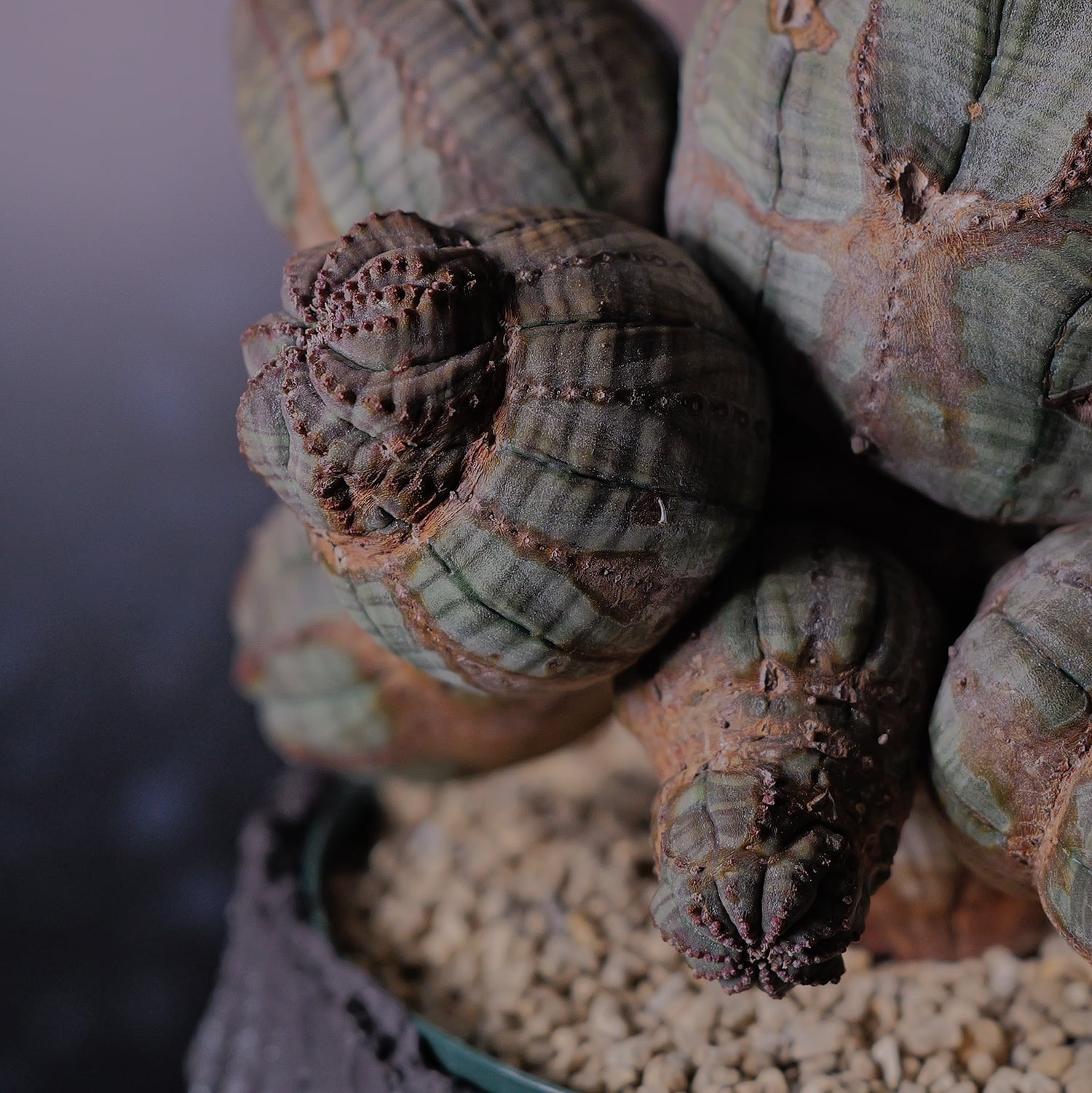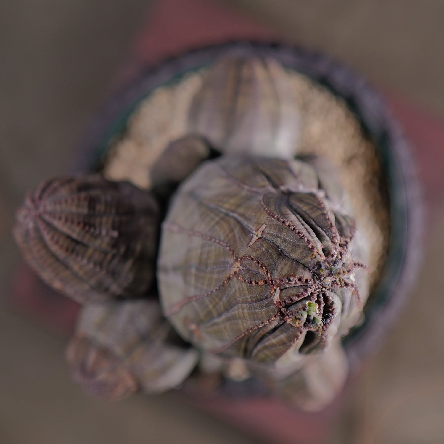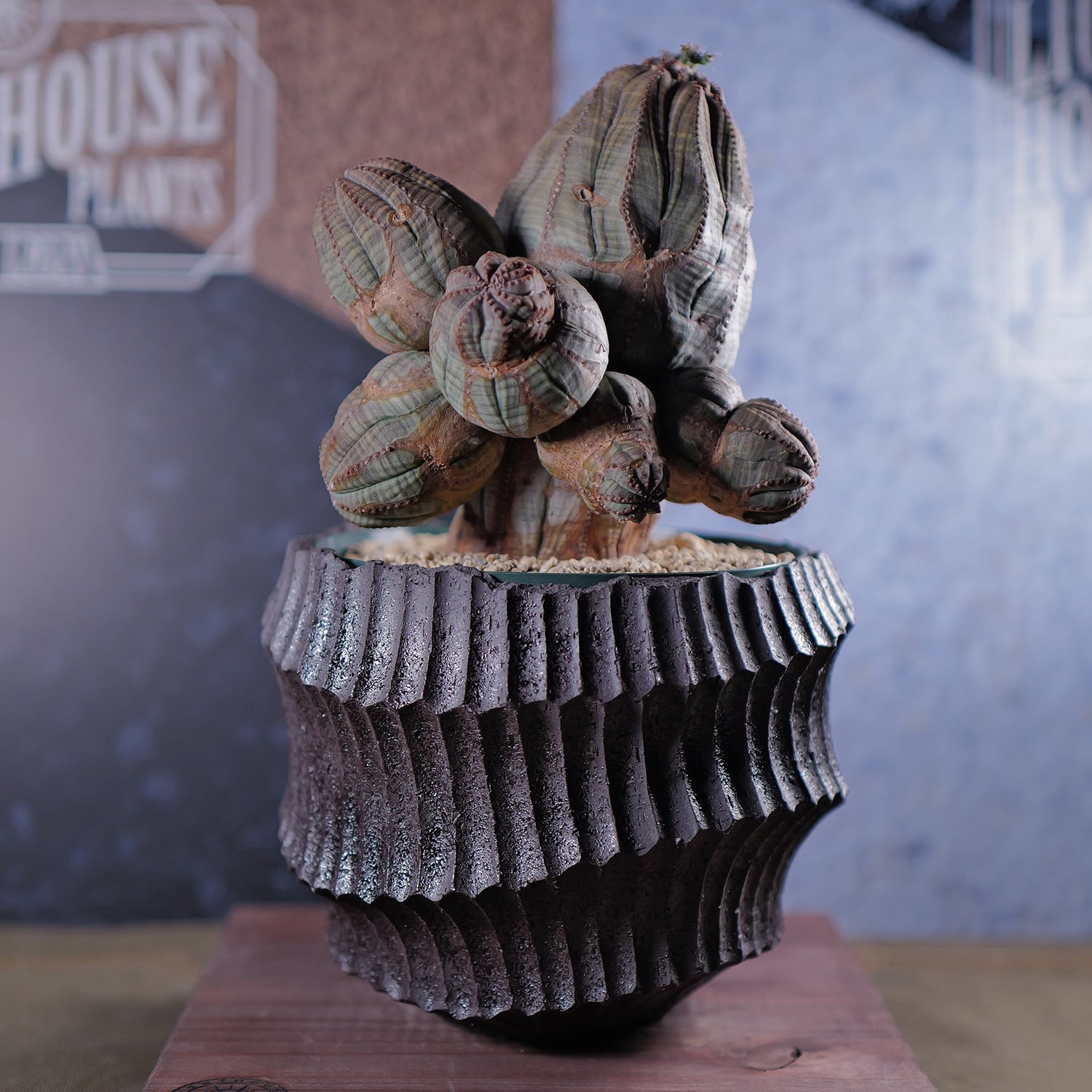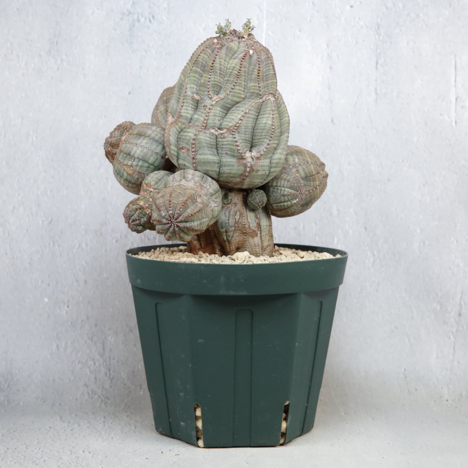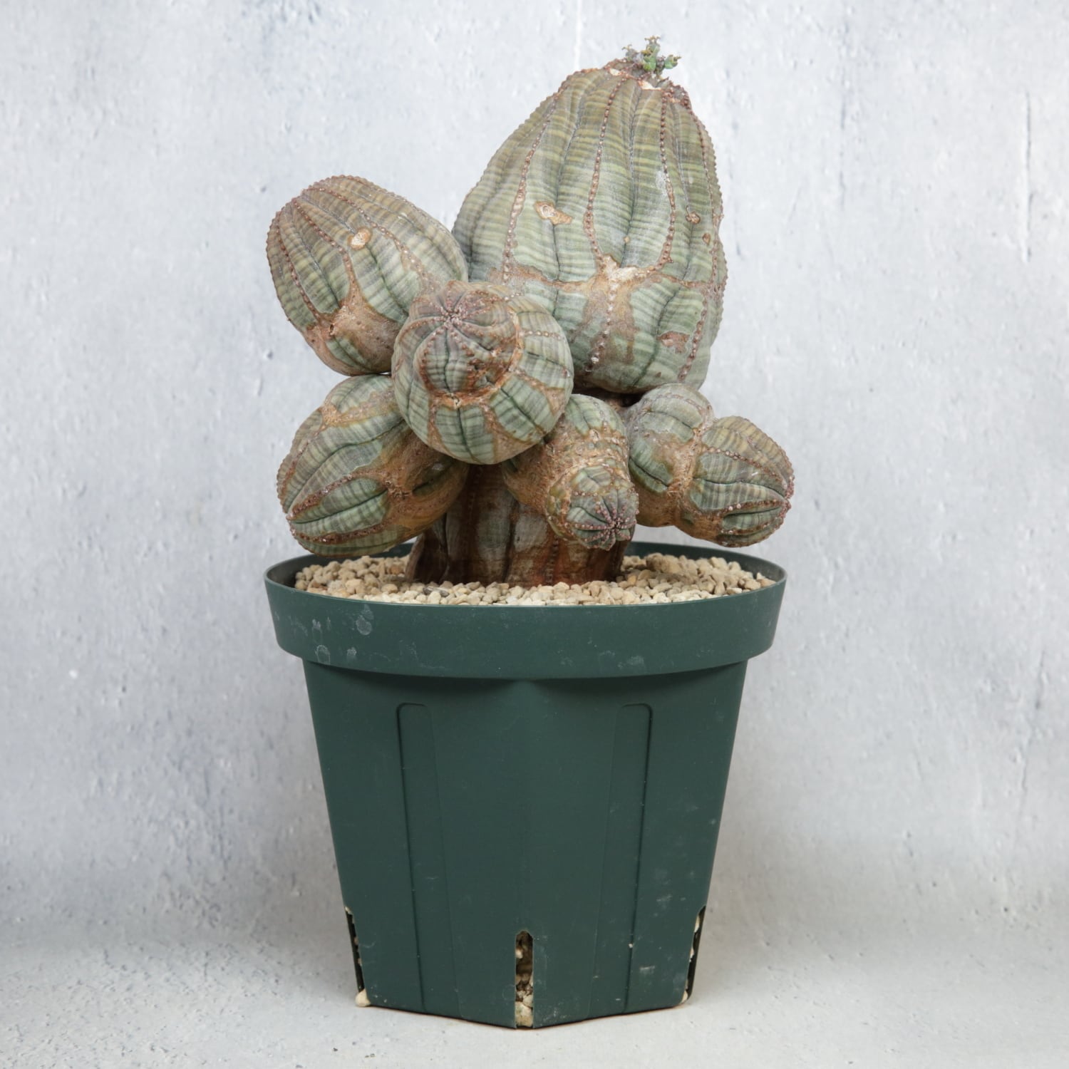 A vintage Euphorbia obesa with a highly abnormal clustered form.