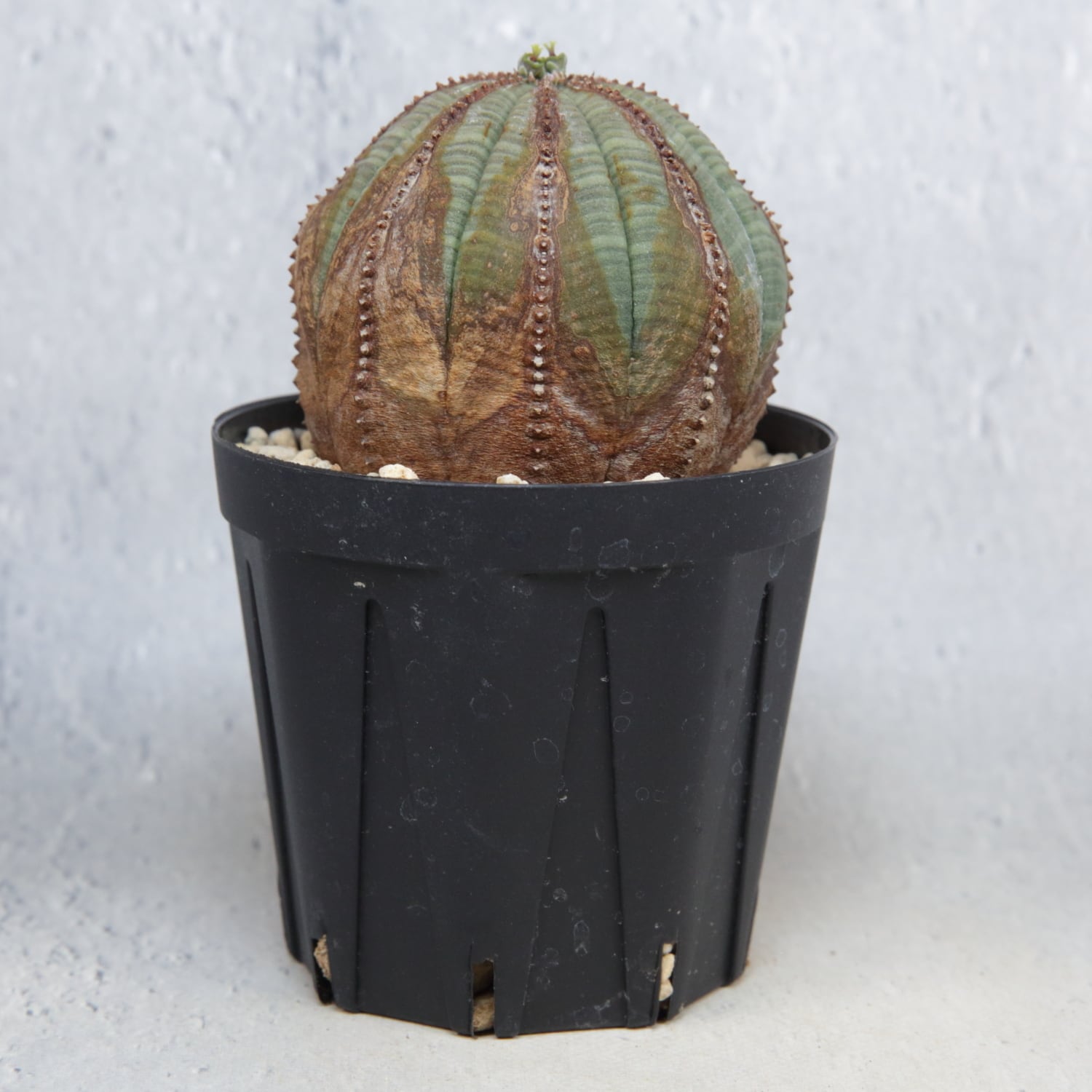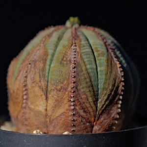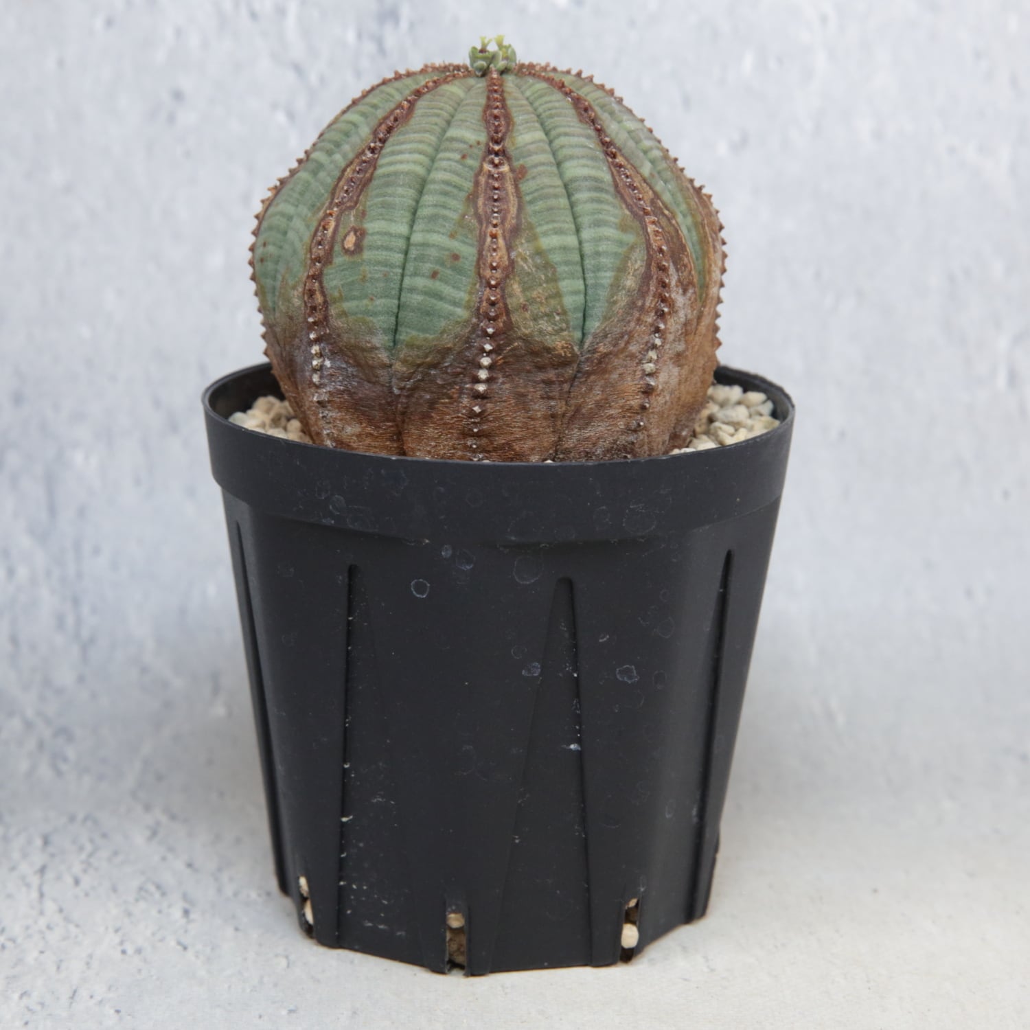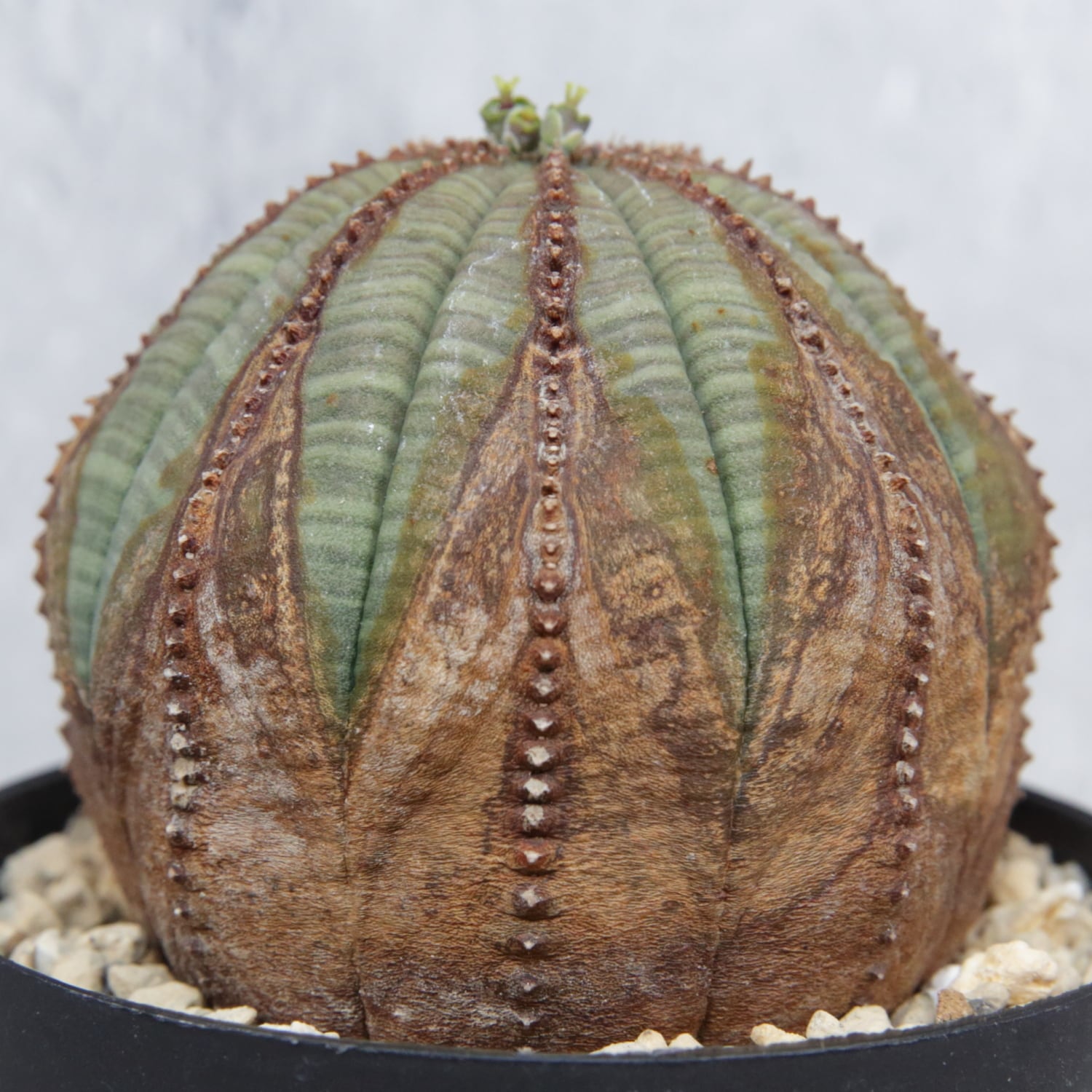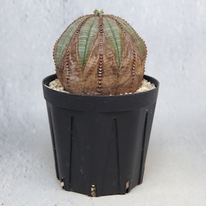 A well-shaped, beautifully patterned Euphorbia obesa with natural corking.
