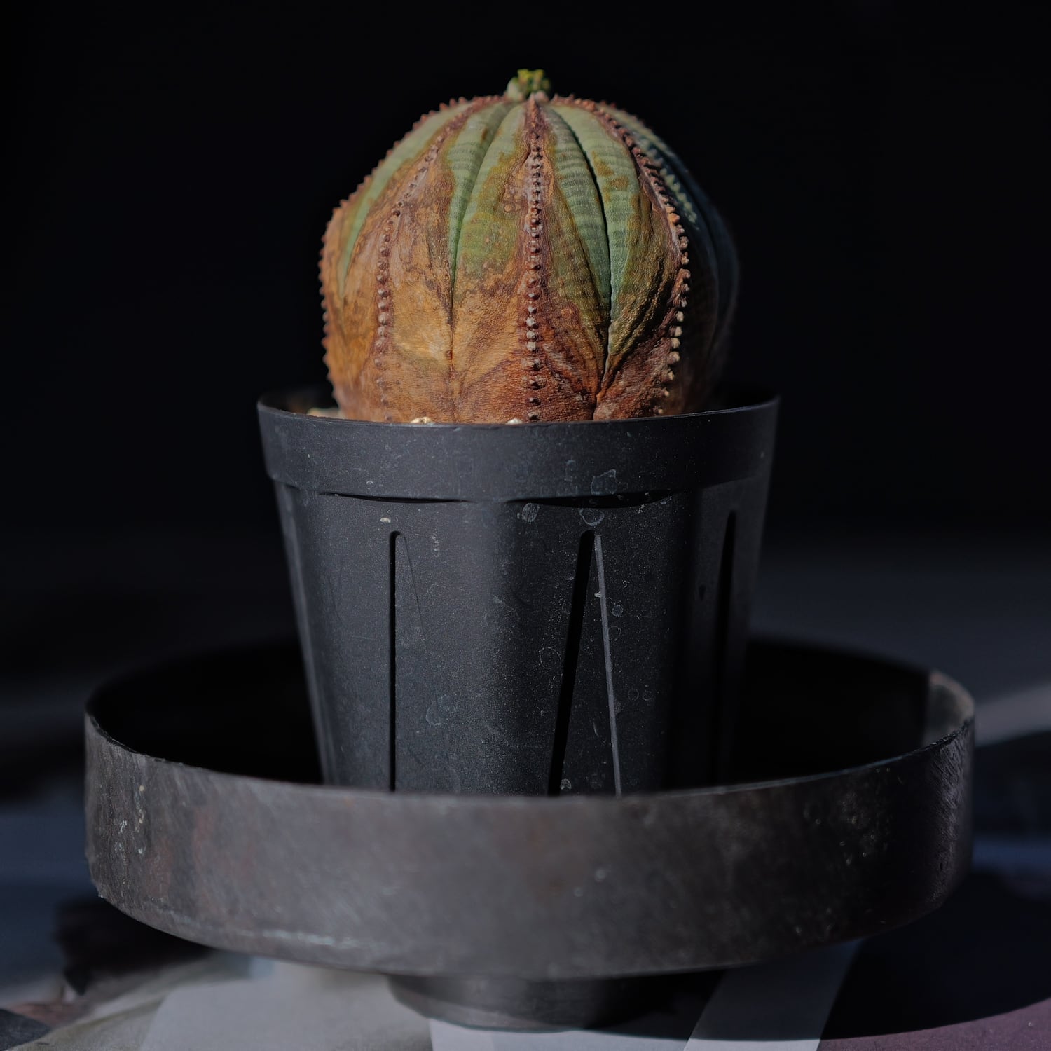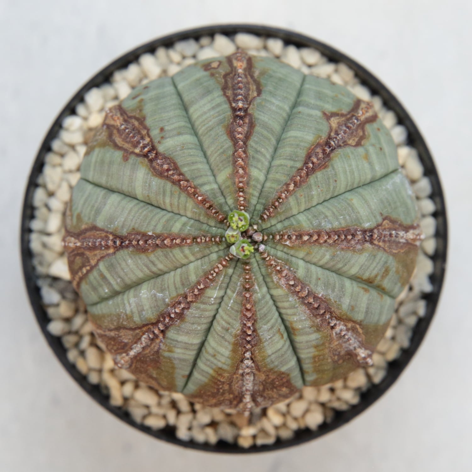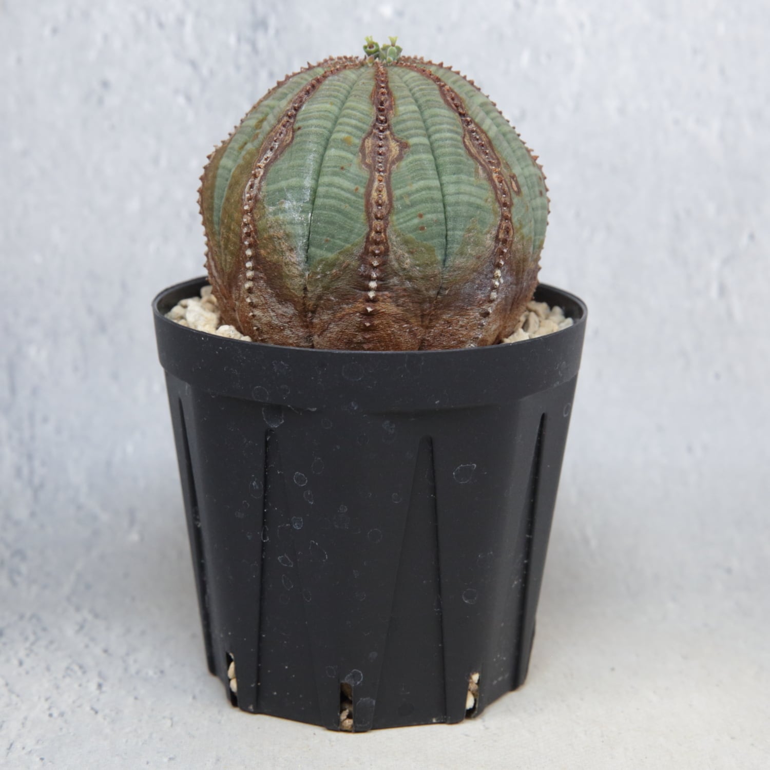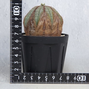 A well-shaped, beautifully patterned Euphorbia obesa with natural corking.