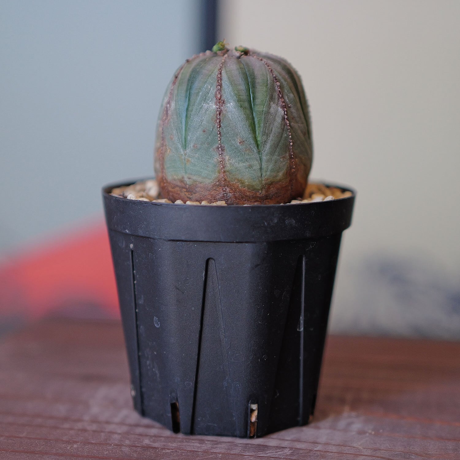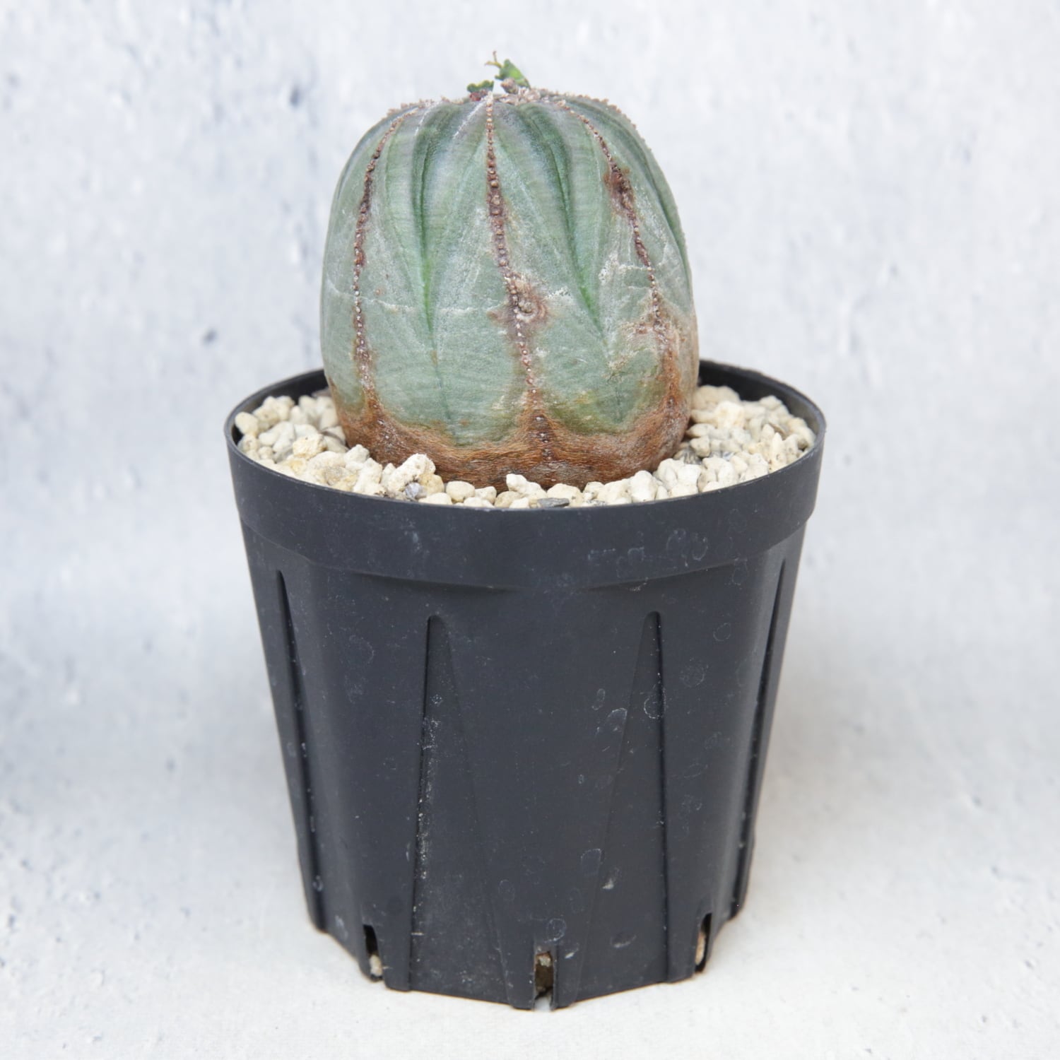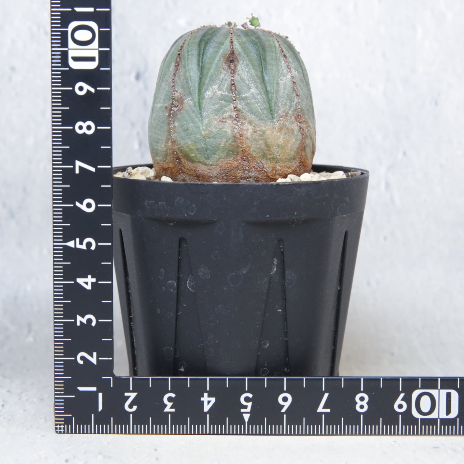 這株微型布紋球呈現細長的山形輪廓,下半部的木質化帶出古木般的質感。