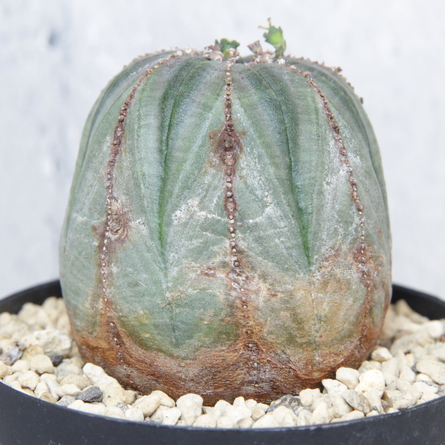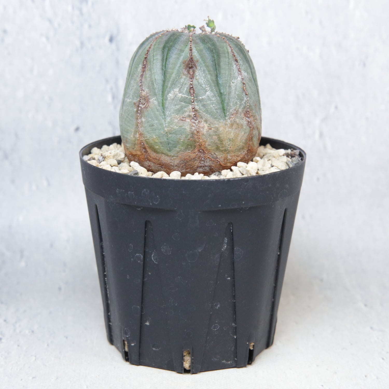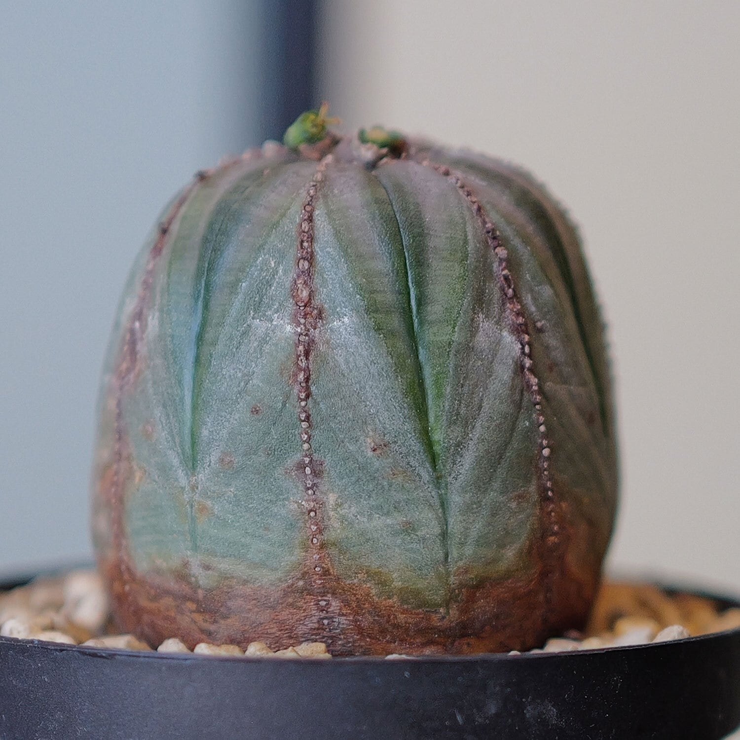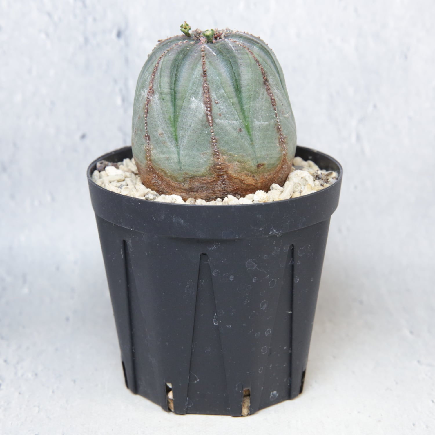 這株微型布紋球呈現細長的山形輪廓,下半部的木質化帶出古木般的質感。