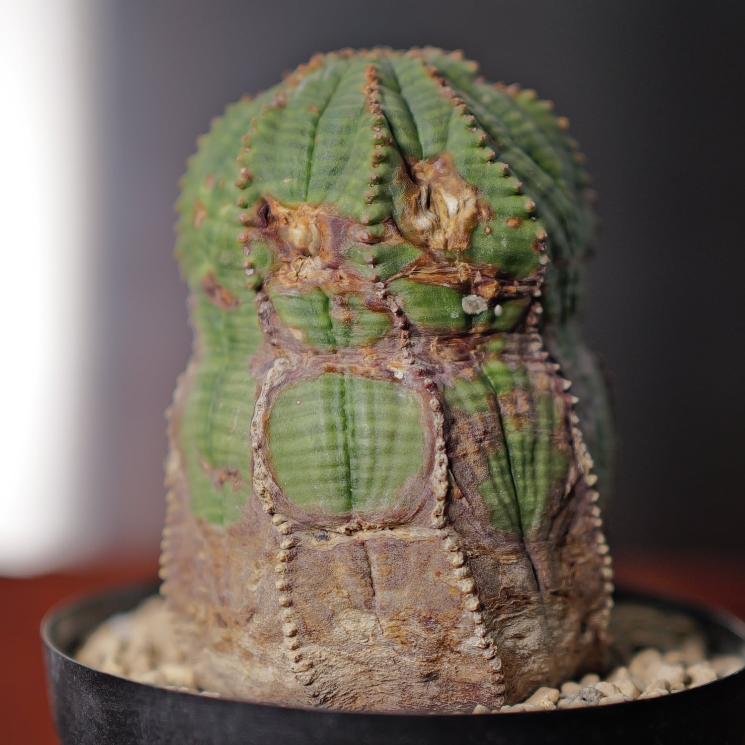 親株はしっかり木質化し、上部の新しい成長とのコントラストがはっきり現れています。
